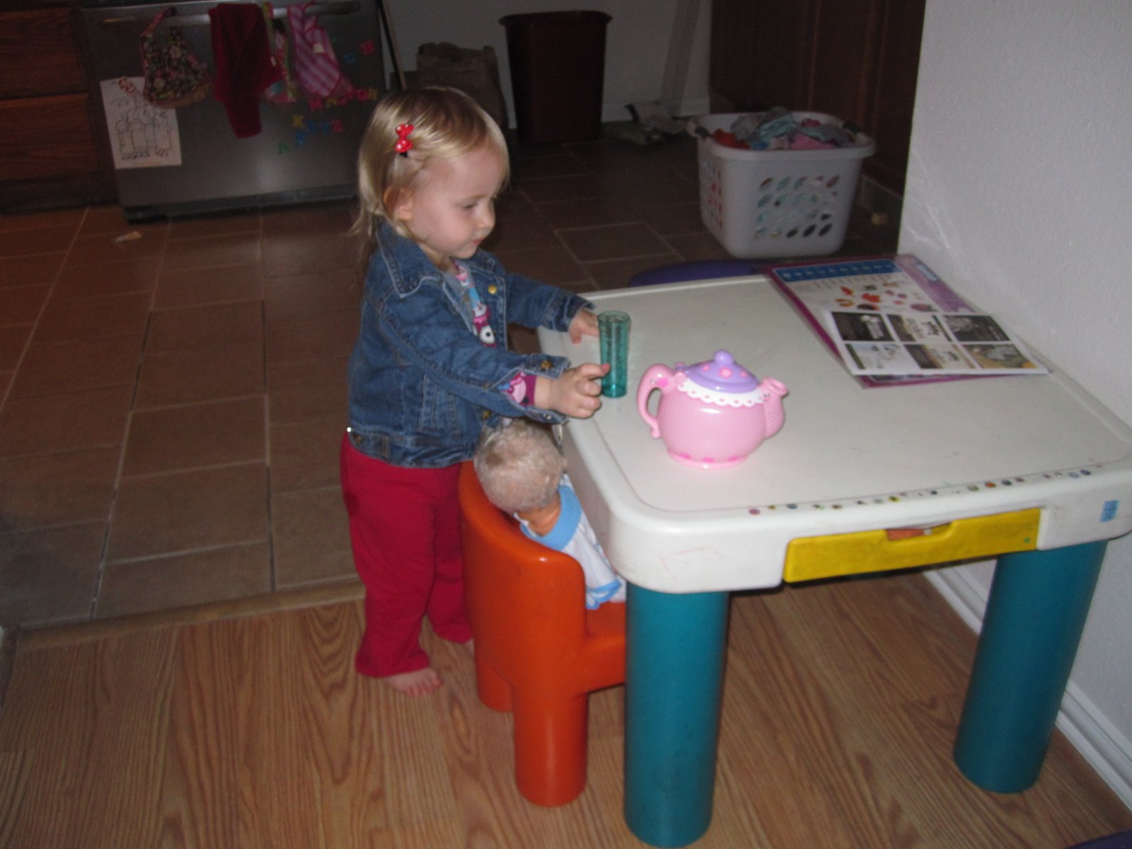 11:30am - Got some yogurt and applesauce for Grace, started a load of diapers and checked on Andrew, who is sleeping soundly. Grace finishes her breakfast and has a blast pouring her water back and forth from her cup to her bowl. She's trying so hard to be careful, I let her do it. :-)